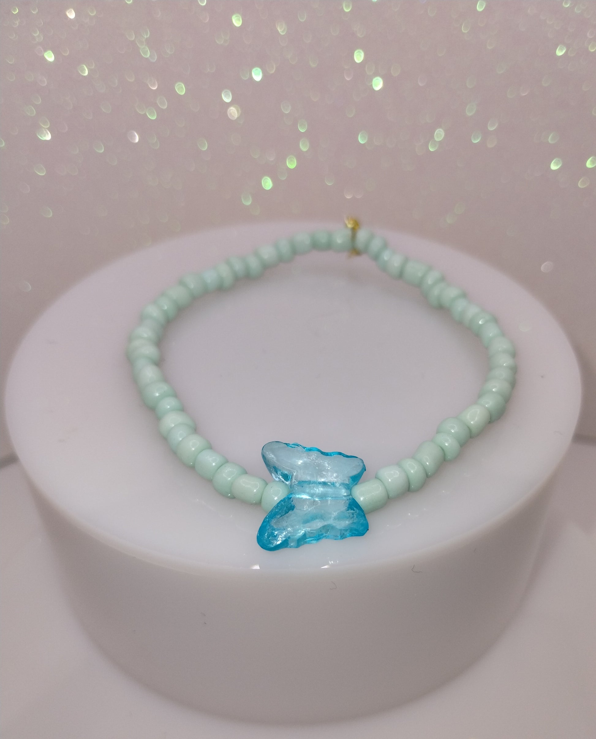 - Light blue porcelain mini beads with butterfly charm at the bottom