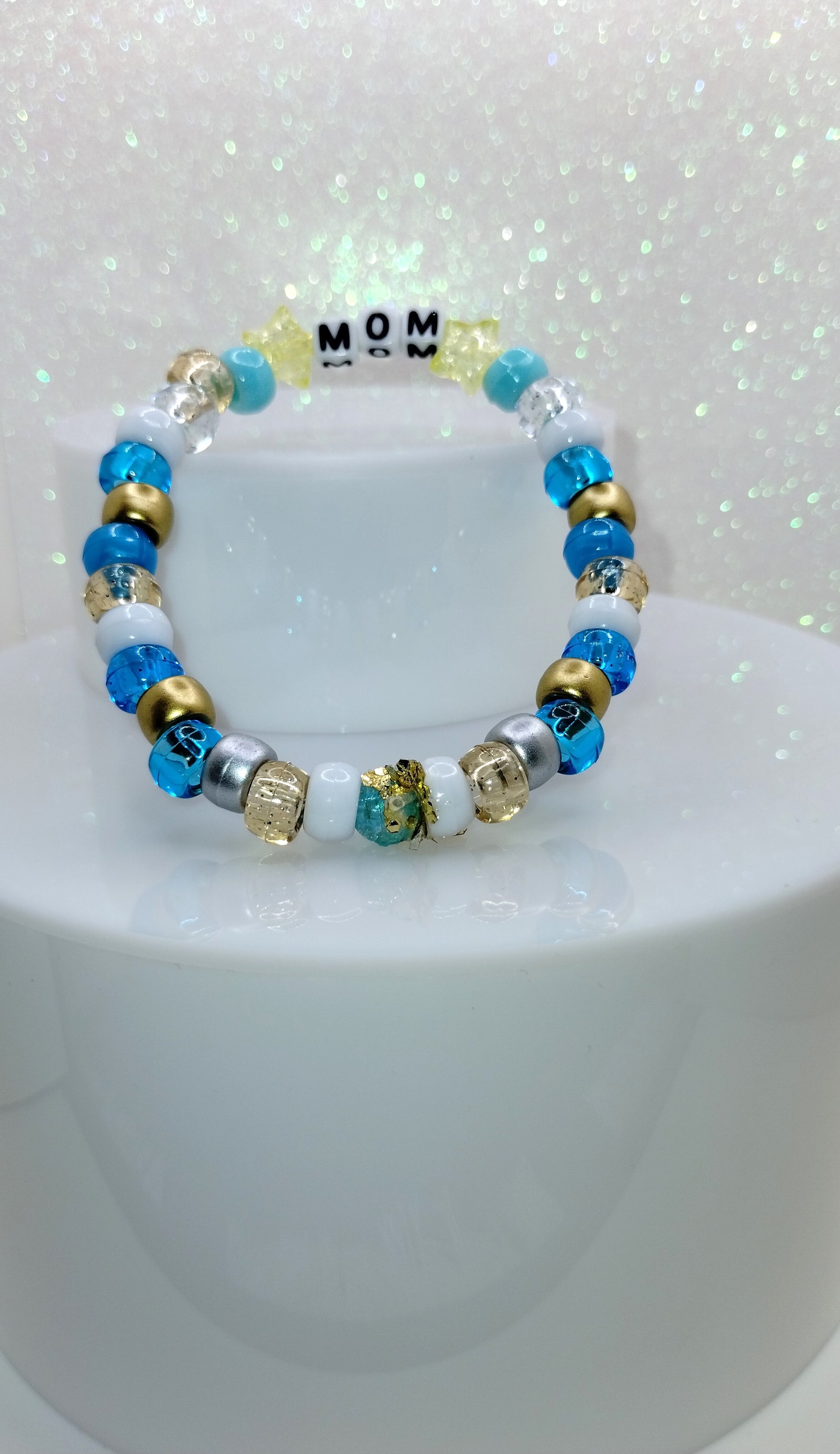 - Blue, white and gold colors with "MOM" crafted at the bottom