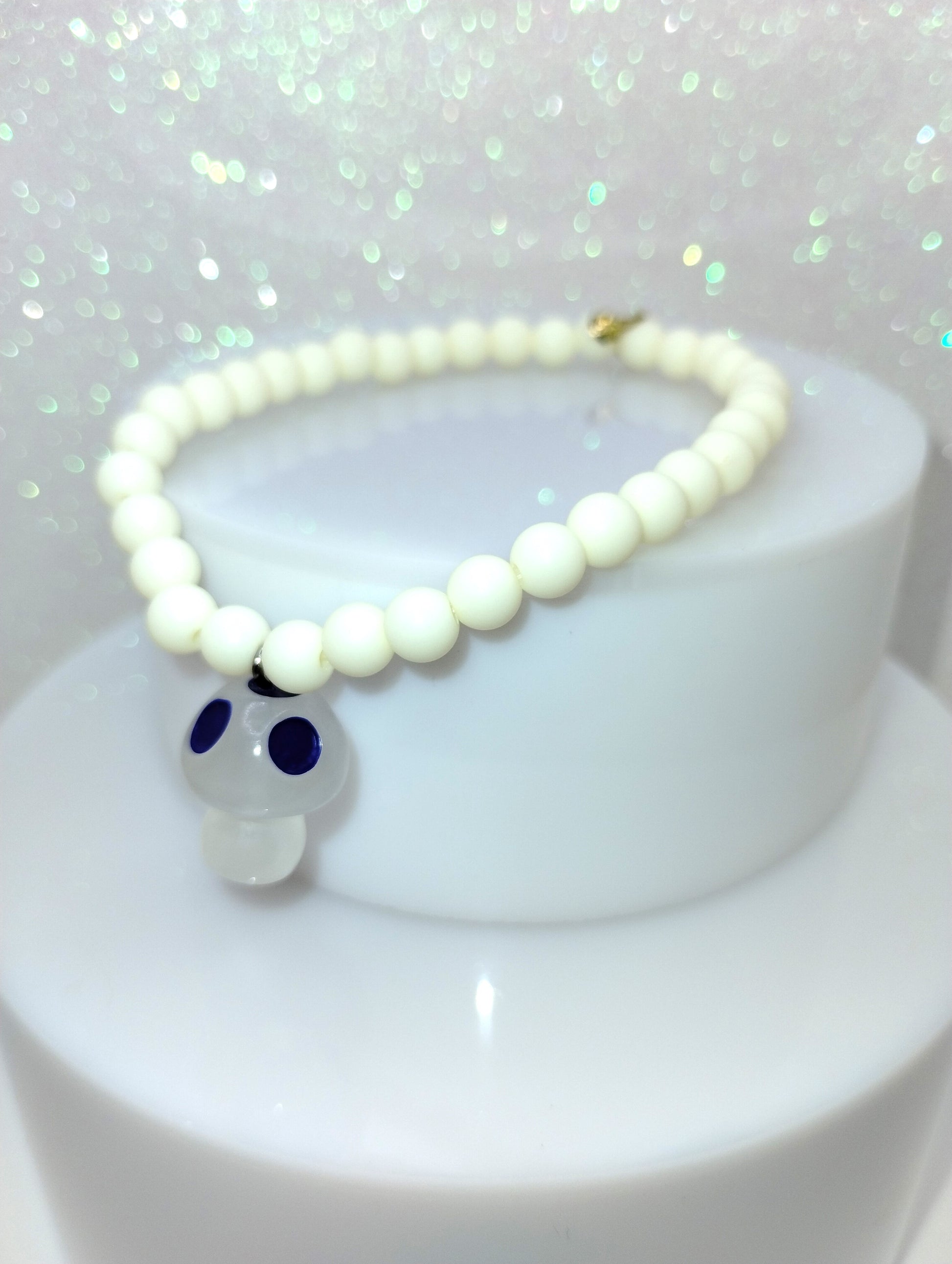 - White pastel beads with dark blue mushroom charm
